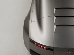 Il frontale colpisce subito: una griglia verticale nera diventa elemento centrale e strutturale dell’auto. È un richiamo diretto a icone come l’Auto Union Type C del 1936 e l’Audi A6 del 2004, reinterpretati in chiave futuristica. A incorniciarla, una firma luminosa a quattro segmenti LED, che richiama in modo stilizzato i quattro anelli del marchio.